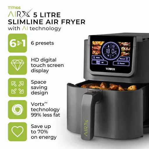 Introducing the UK’s first Air Fryer with AI technology! The AIRX AI Digital Air Fryer will take cooking to the next level. Using an intelligent sensor and AI technology, the air fryer analyses the volume of food inside the chamber to determine the optimum cooking temperature to create perfectly cooked meals for the family to enjoy. Exclusive to Tower Air Fryers, Vortx technology rapidly circulates hot air around food. Cooking up to 30% faster than a conventional oven and using 99% less oil, allowing you to save up to 70% on your energy. The High Definition TFT screen offers an enhanced user experience, with crystal clear images and one touch functions that make mealtimes fuss-free. A manual mode will let you test out unique recipes and tailor meals to suit different tastes for versatile cooking, whilst the smaller design means it takes up less space on your worktop without losing any cooking power. Choose from 6 cooking pre-sets including Chicken, Fries, Fish, Prawn, Cupcake Steak to take the guesswork out of cooking. The 5L capacity is perfect for cooking family meals or more of your air fryer favourites.