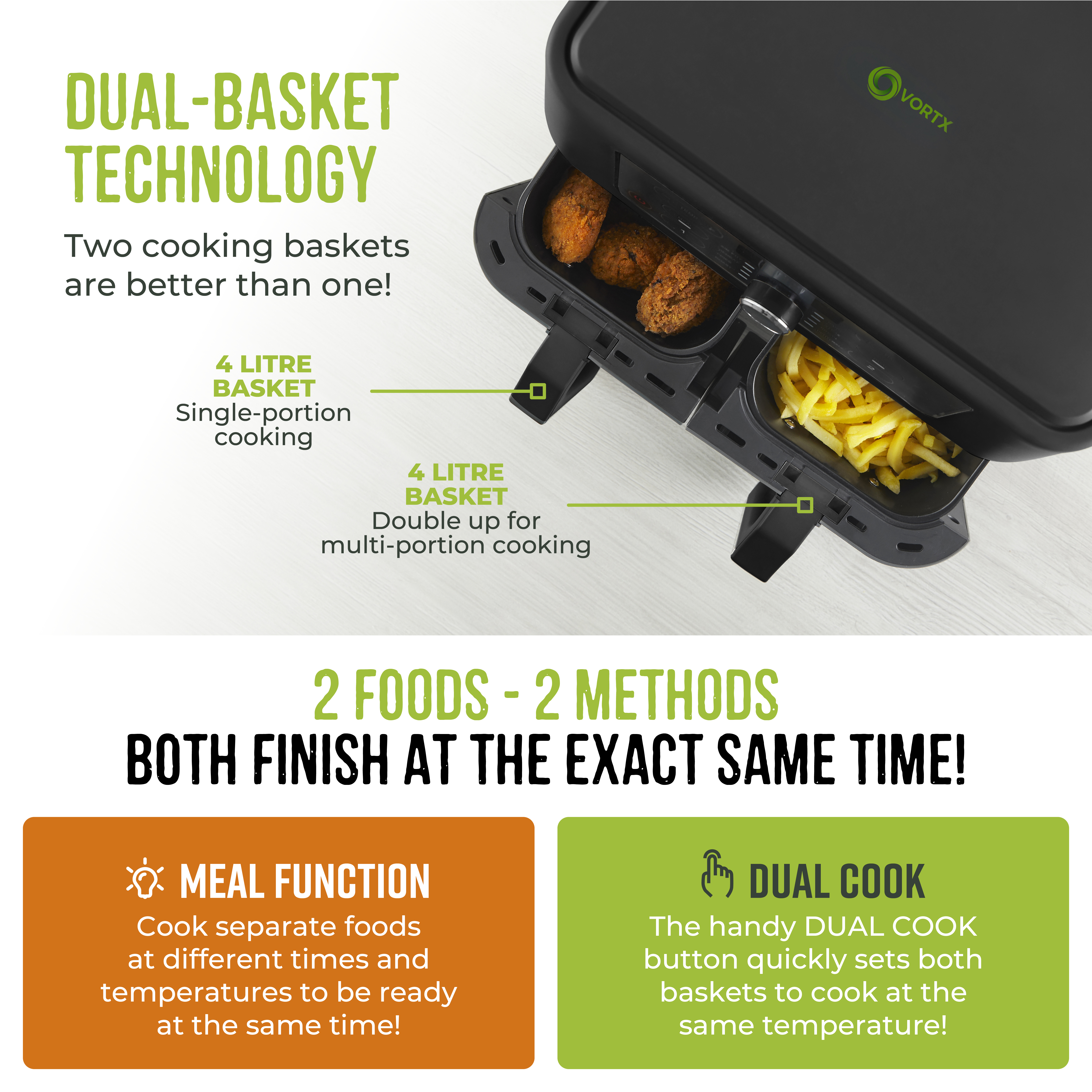 At the touch of a button, the Meal Function will control cook times so that both baskets finish cooking at the same time.