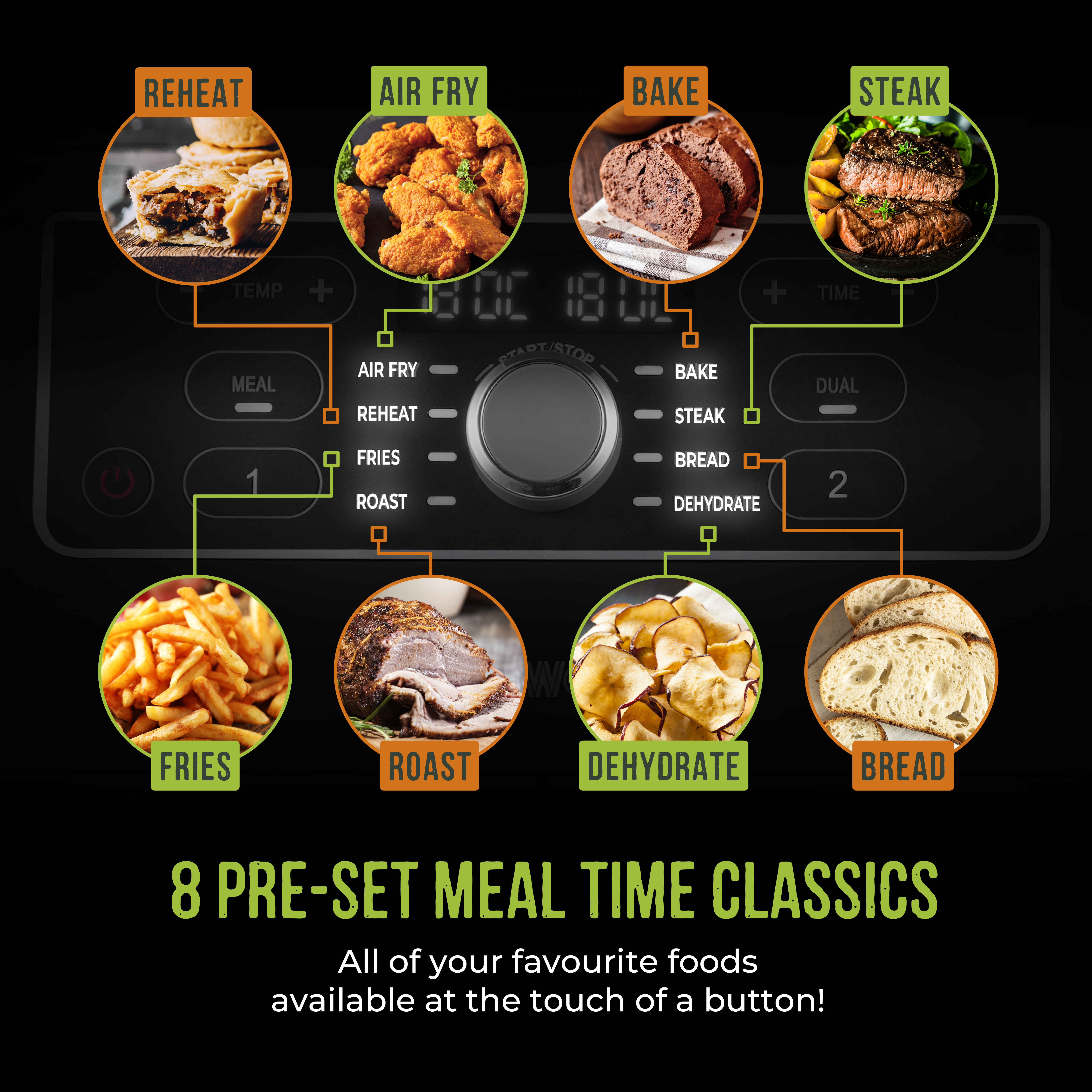 All your favourite foods available at the touch of a button! Choose from 8 one-touch pre-sets to take the guess work out of cooking including air fry, reheat, fries, roast, bake, steak, bread and dehydrate