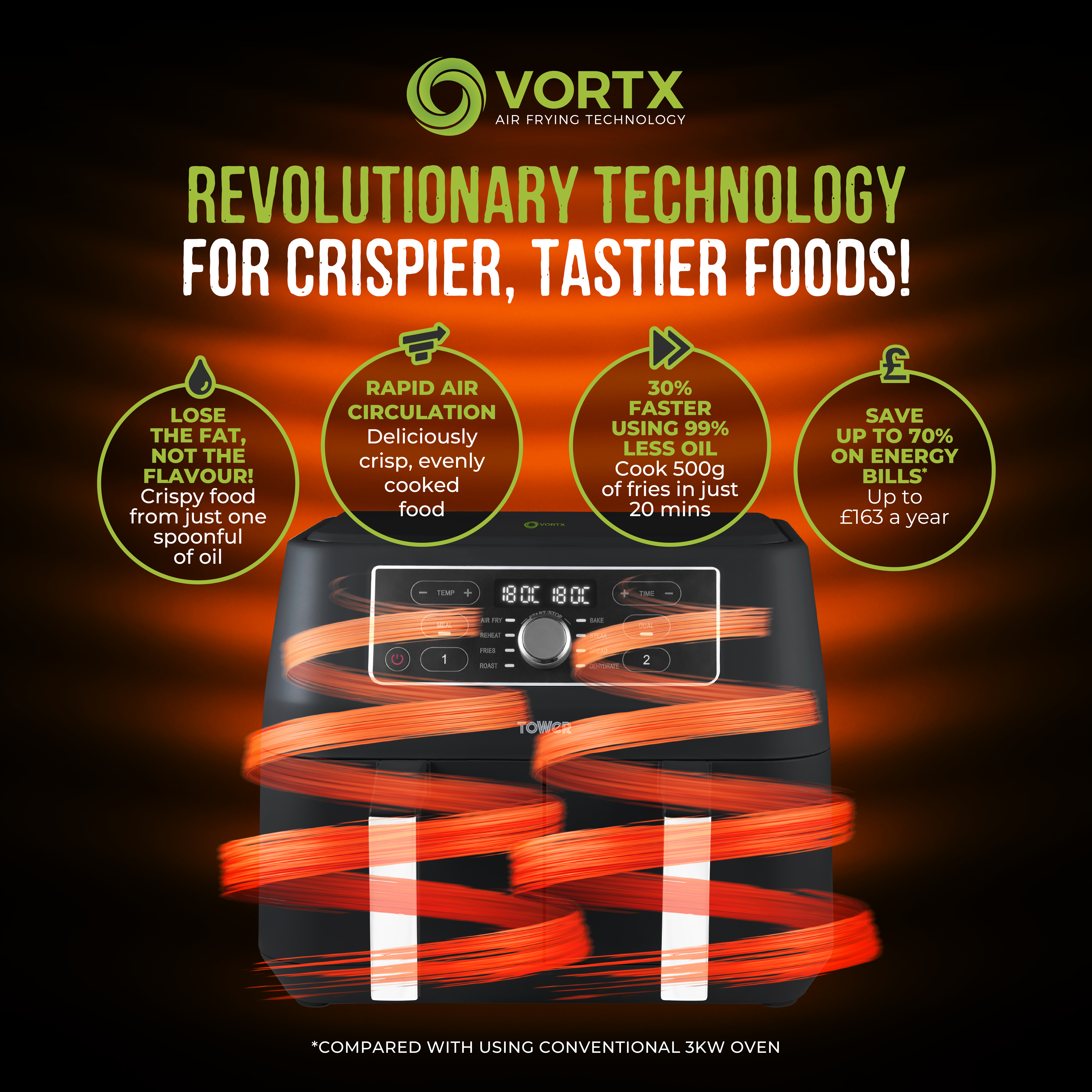 Exclusive to Tower Air Fryers, Vortx technology rapidly circulates hot air around food, cooking up to 30% faster than a conventional oven. Vortx also cooks food with a delicious crispy texture and because little or no oil is required, it’s much healthier, too! Lose the fat not the flavour with Vortx Air Frying Technology