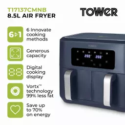 Exclusive to Tower Air Fryers, Vortx technology rapidly circulates hot air around food. Cooking up to 30% faster than a conventional oven and using 99% less oil, allowing you to save up to 70% on your energy. The Dual Basket Air Fryer boasts two baskets to provide the ultimate in air frying versatility, giving you the freedom to cook single portions or larger portions, as required. You can cook separate meals simultaneously in the two 4.25L compartments with a combined capacity of 8.5L, enough to feed up to 10 people at once. The Sync Finish function will control cook times, so that both baskets finish cooking at the same time. No more juggling multiple cooking times for easy meal preparation. You can also choose from 6 preset options so you can cook crispy fries, moist chicken, succulent steaks or bake delicious cakes. It Is also possible to reheat and dehydrate food with your air fryer through the digital touch panel. Non-stick coatings on the baskets ensure an easy clean up, whilst cool touch handles will protect you from burnt fingers.