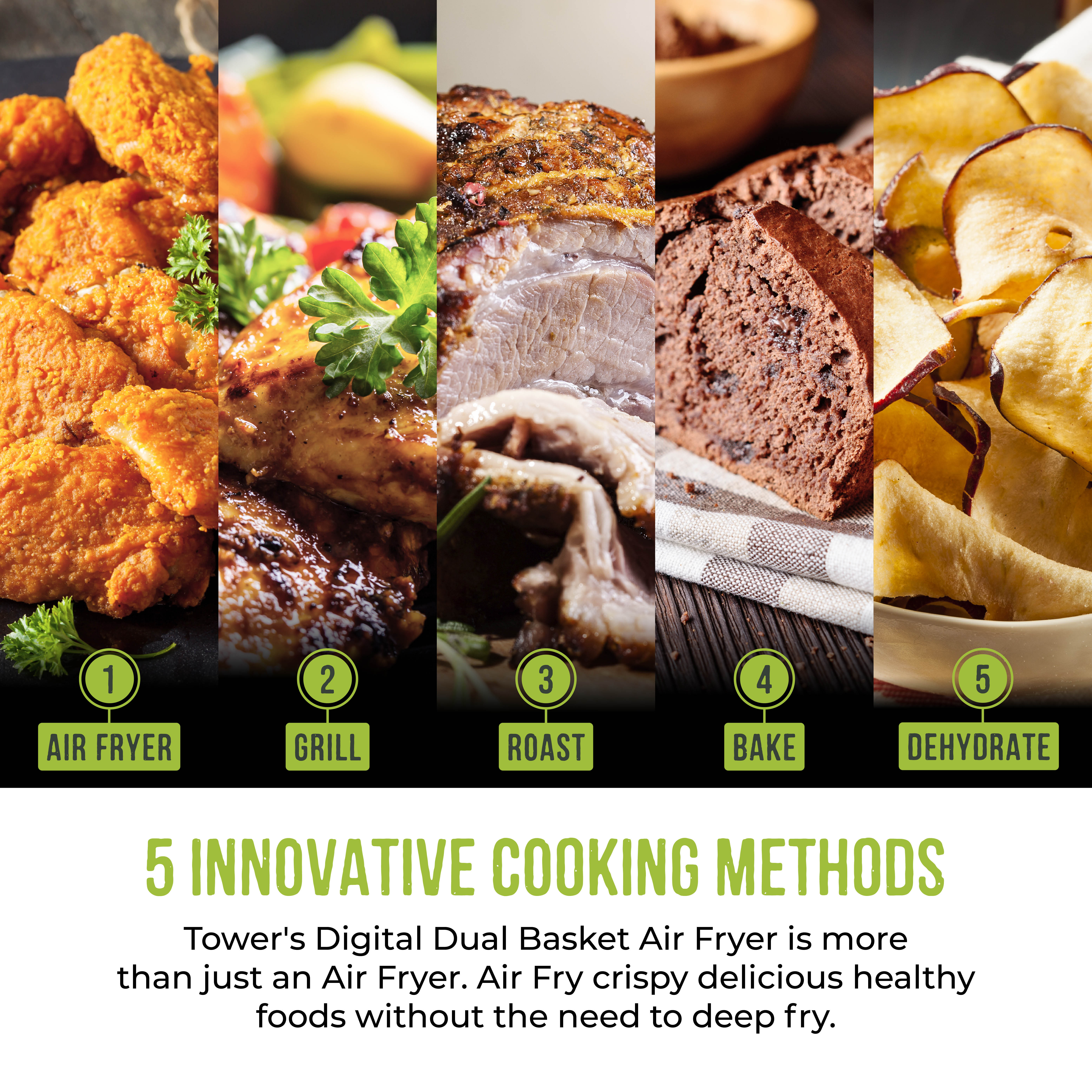 Tower Air Fryers are powerful and cook food up to 30% faster than conventional ovens, yet they also use far less energy.? Save up to 70% on your energy by simply switching to Tower Air Fryer cooking, which could reduce your energy bills by £163 per year