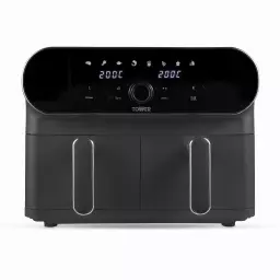 Cook larger meals for the whole family with this 10.4L Dual Basket Air Fryer from Tower. Two 5.2L baskets will cook food independently with individual timers and temperature settings for larger portions or cooking multiple food types at once. Featuring Vortx technology, food will cook 30% faster than in a conventional oven, for delicious crispy meals that requires little to no oil. Use the Sync function to set different foods to cook and be ready at the same time, whilst the intelligent Dual Cook function will synchronise cooking settings for cooking larger portions of food. Choose from 8 cooking presets including Steak, Drumsticks, Fish, Prawns, Fries, Pizza, Cake and Dehydrate for fuss free cooking, whilst the digital control panel makes it simple to cycle through cooking settings and temperatures. The letters SHK will appear on the display two thirds of the way before cooking, reminding you to shake the basket for a more thorough and even cook. Non-stick removable grill plates offer simple cleaning so cooking is fuss-free from start to finish.