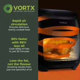 Exclusive to Tower Air Fryers, Vortx technology rapidly circulates hot air around food, cooking up to 30% faster than a conventional oven. Vortx also cooks food with little or no oil, making it much healthier, too! Lose the fat not the flavour with Vortx Air Frying Technology