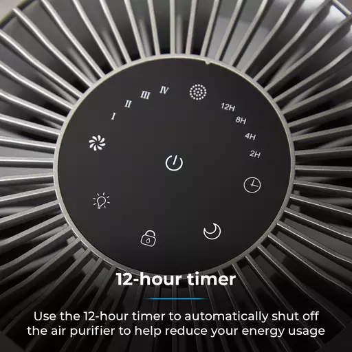 Operates at a low decibel setting, with the display automatically dimming the LED lights to create a peaceful sleeping environment. The 12-hour timer automatically shuts off the air purifier