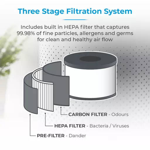 HEPA13 filters 99.98 percent of fine particulates in rooms up to 14m2Carbon filter removes odours and gases for clean refreshing air