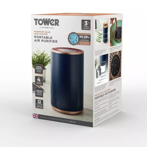 Our efficient TOWER Desktop Air Purifier has a 99.98% filtration rate with a HEPA 13 filter to remove fine particulates.  The pre-filter captures pet dander and other large particles whilst the carbon filter removes gases and odours. Clean air is then delivered at a rate of 120m³/h, ideal for rooms up to 14m².  A powerful PM 2.5 Dust Sensor indicates air pollution levels and the filters’ 1500-hour lifespan is monitored by the clever built-in replacement indicator.