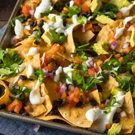 Arrange tortilla chips on a baking sheet, top with grated cheese, black beans, diced tomatoes and onion, jalapenos, and any other desired toppings. Bake until the cheese is melted, then serve with guacamole, sour cream and coriander for an authentic flavour.
