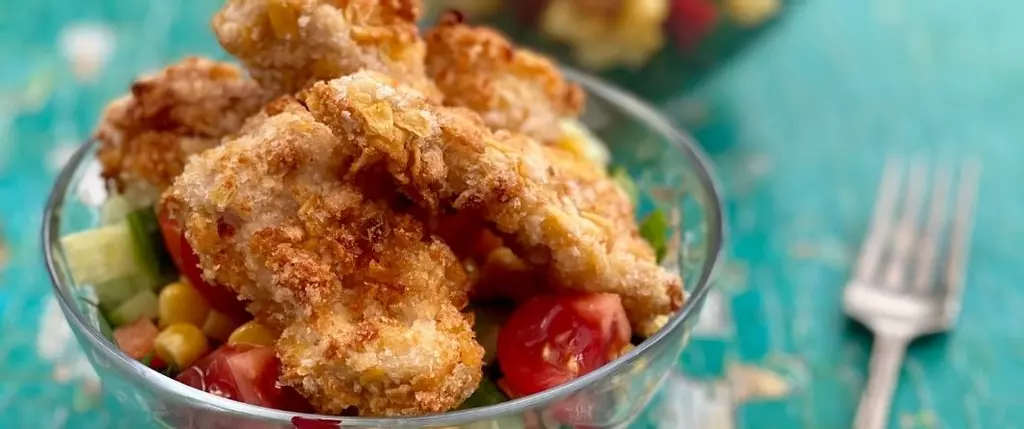 4. Spray the chicken lightly with oil, then place half in the air fryer basket in a single layer and cook for 8-10 minutes at 190C, shaking the basket halfway through until the chicken is cooked and the coating is crisp and golden. Repeat with the remaining nuggets.