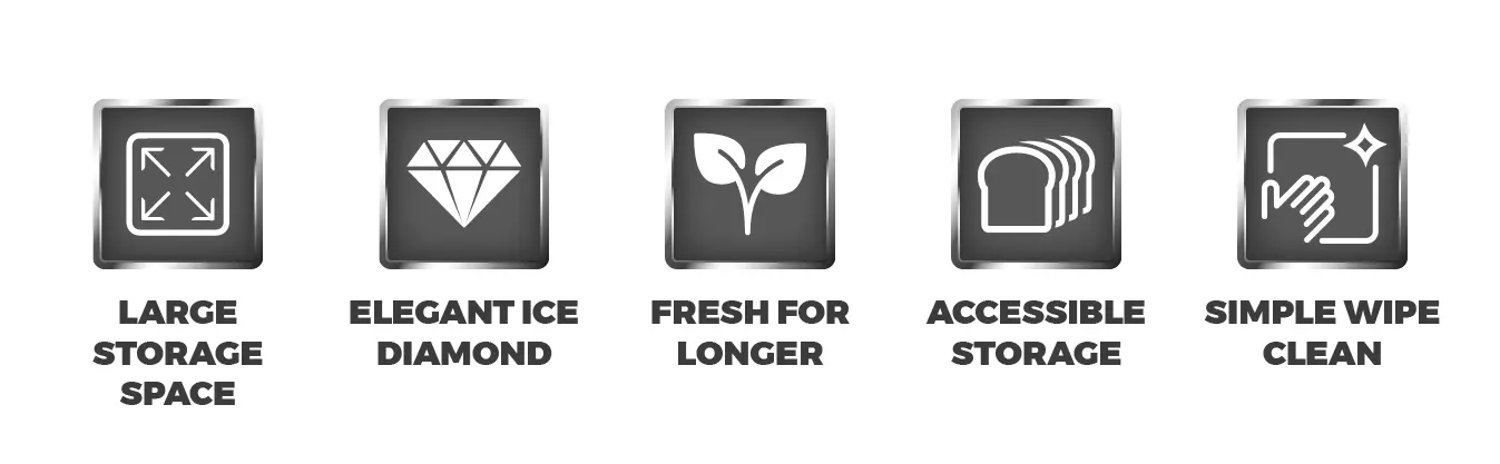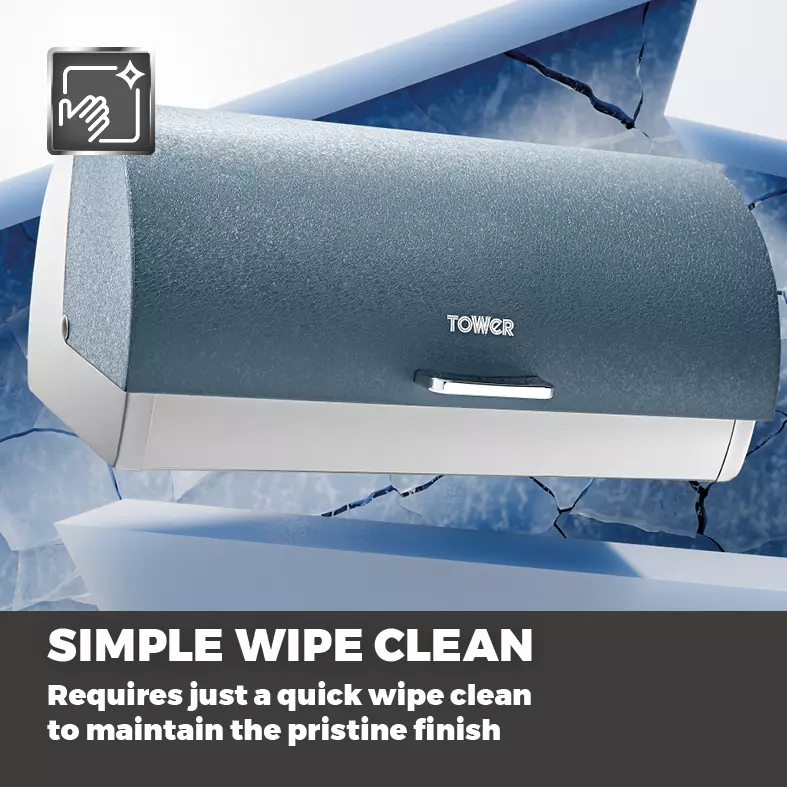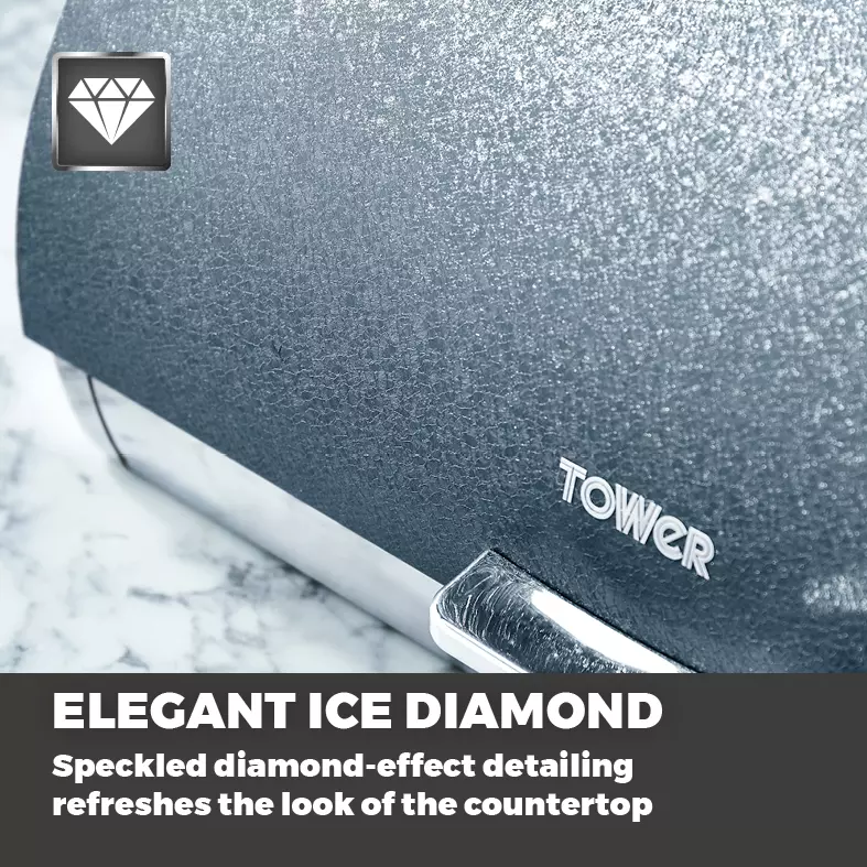 Tower’s Ice Diamond bread bin provides premium storage for your fresh baked goods. Its speckled ice diamond detailing is complemented by a sleek mirrored stainless steel body to give your countertop a touch of contemporary appeal. The built-in ventilation system traps moisture to prevent goods from being dried out, preserving their fresh texture and taste for longer.