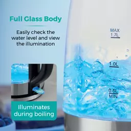 Large 2200W 1.7 Litre Capacity Boils 7 cups at onceGlass body with black plastic and stainless steel housing