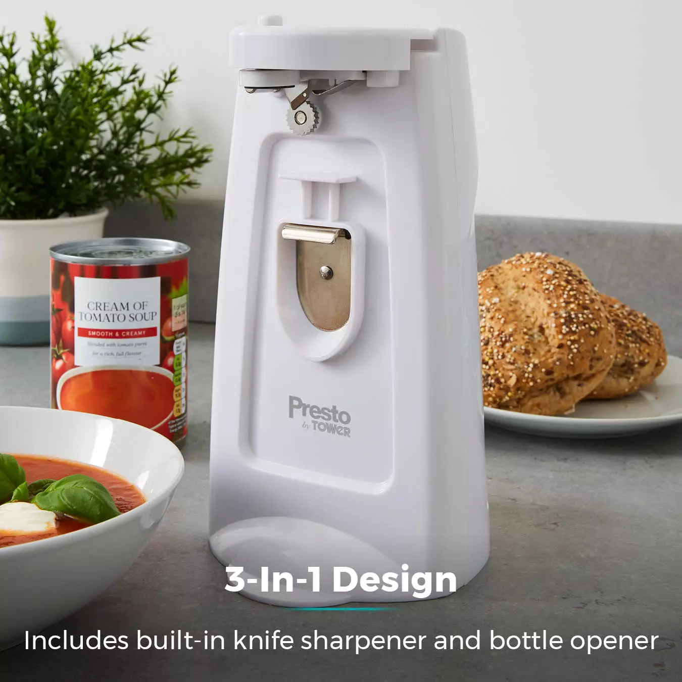 Tackle your daily kitchen tasks with the Tower Presto 3-In-1 Electric Can Opener with Knife Sharpener and Bottle Opener. This simple to use device opens cans super-fast at the push of a button and secures the lid in place without falling into the cans contents, until you???re ready to safely dispose of it. The built-in knife sharpener helps keep your kitchen knives razor sharp, so you???ll never be food prepping with dull blunt blades again.