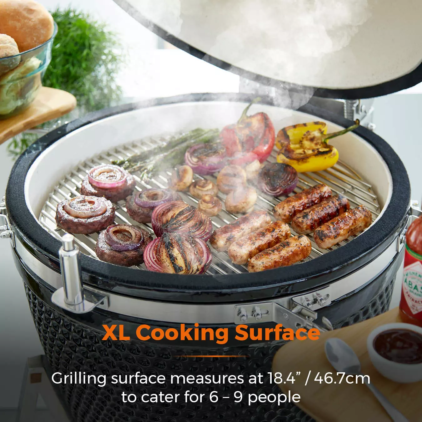 Tower's Kamado XL Ceramic Charcoal BBQ provides ultimate charcoal tasting foods that all the family and guests will enjoy. Its modern, embossed design will look fantastic in any garden, with a grilling surface measuring at 46.7cm to cater for 6 - 9 people, allowing you to create juicy burgers, charred halloumi skewers and succulent steaks for family and guests to enjoy.
