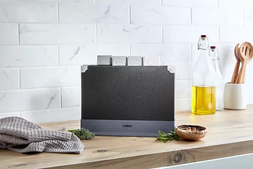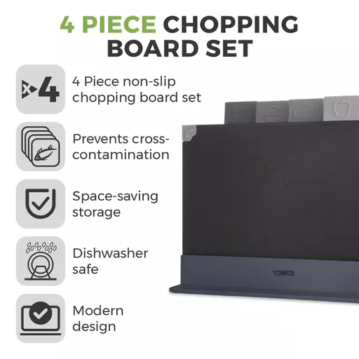 The Tower 4pce Chopping Boards Set with stand is a great solution for any modern kitchen. It helps you to store your chopping boards neatly and conveniently in one place on your worktop. Each of the chopping boards measures 29cm (W) x 0.6cm (D) x 22.5cm (H)