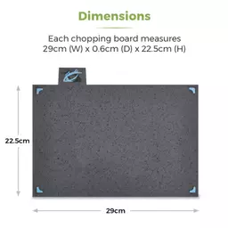 Each chopping board measures 29cm (W) x 0.6cm (D) x 22.5cm (H). A great and convenient size for all your food preparation needs.