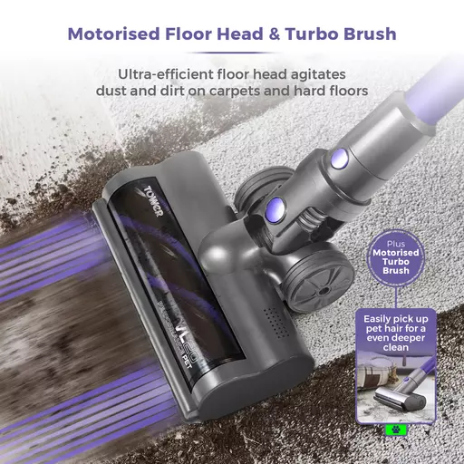 Ultra-efficient motorised floor head agitates dust and dirt leaving carpets and hard floors clean and fresh