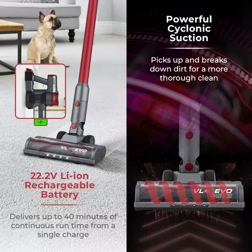 Effortlessly achieve a more efficient and deeper clean around the home with the VL40 Pro Pet 3-in-1 Vacuum Cleaner. Its powerful built-in rechargeable battery delivers 35 minutes of continuous run time from a single 4 hour charge for hassle-free cleaning. Use as a cordless vacuum for carpets and hard floors, a detachable handheld for cars, stairs and upholstery or extend the pole for higher hard-to-reach areas like ceilings and curtains. The cyclonic suction provides consistent airflow, effortlessly sucking up and breaking down dirt from all floor types for a thorough clean. Its ultra-efficient motorised floor head agitates dust and dirt leaving carpets and hard floors clean and fresh. The turbo pet and upholstery brush head effortlessly picks up deeply embedded pet hair so you get a more efficient and deeper clean around the home. It transforms into a handheld vacuum that is perfect for staircases, cars, upholstery and pet hair. An anti-allergy HEPA filter removes 99.95% of fine particles from 0.3 microns, making it ideal for allergy sufferers. Its ultra lightweight 1.3kg body is easy to carry and move from room to room, for cleaning up high or down low anywhere in the home