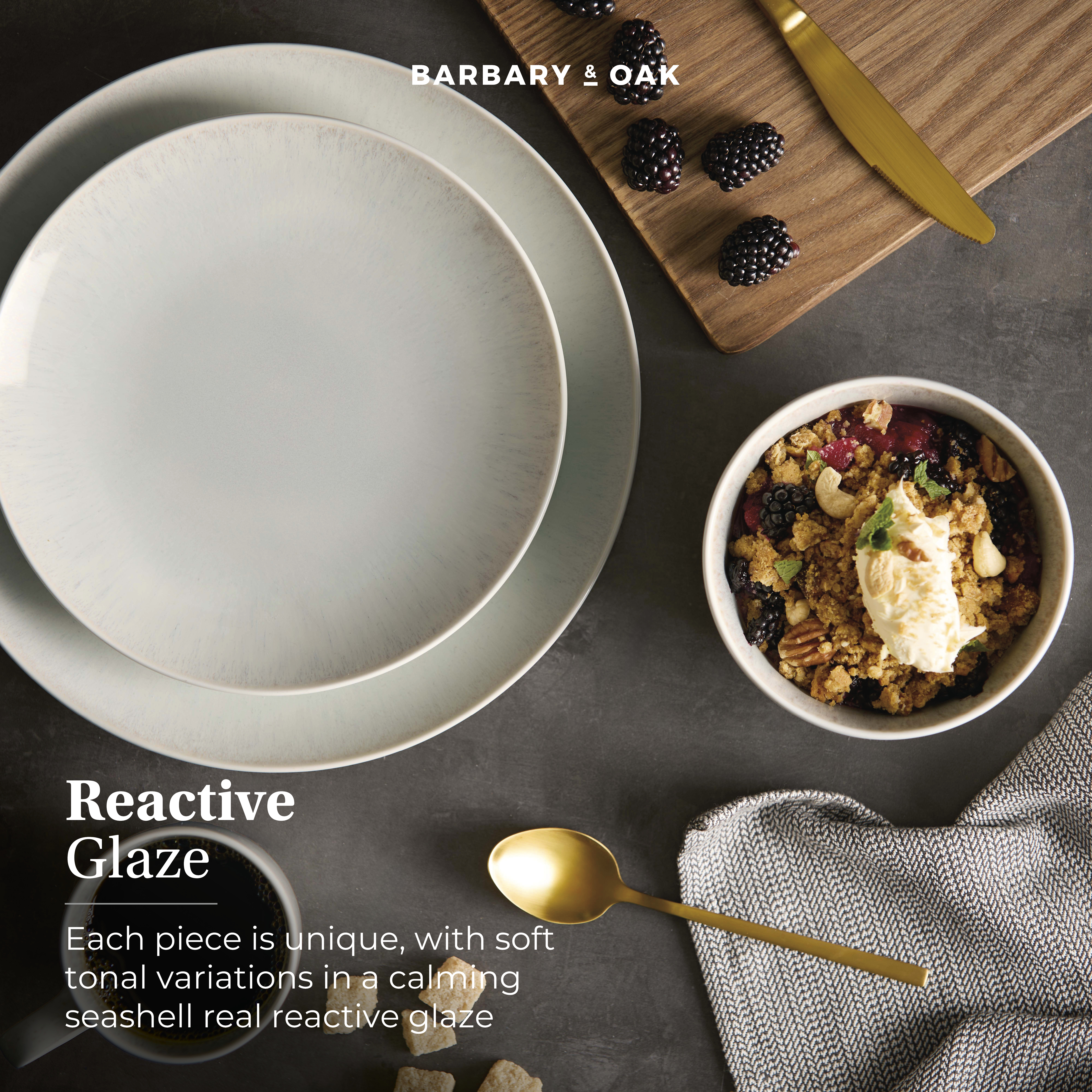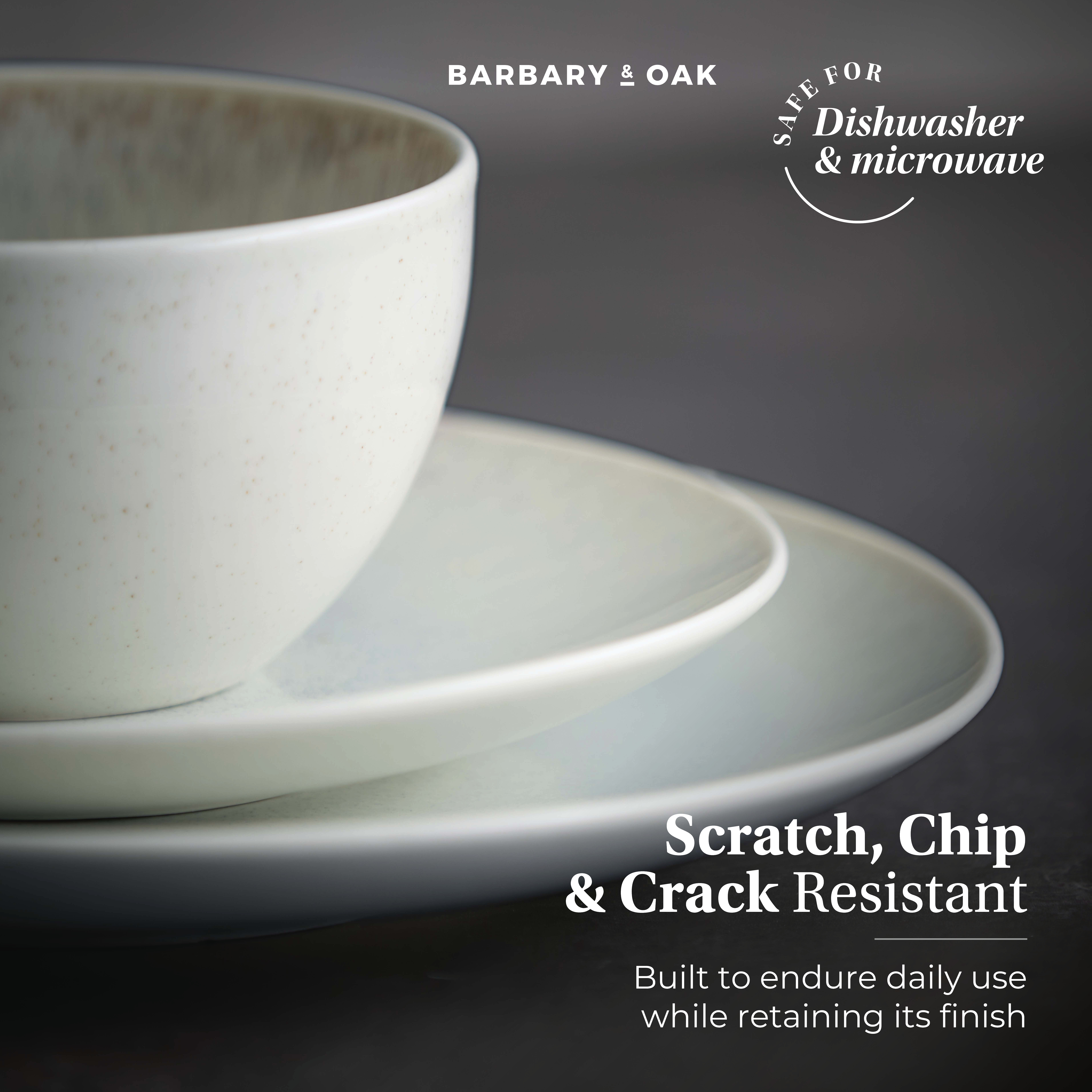 The Barbary & Oak 16 Piece Dinner Set in Seashell blends design-led sophistication with everyday practicality. Each piece displays soft tonal movement from the reactive glaze for a calming, elegant look. Crafted from durable stoneware that’s scratch and chip resistant, it’s both dishwasher and microwave safe — bringing timeless style and effortless function to every home
