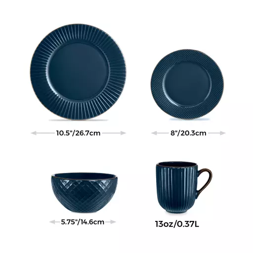 This deluxe dinnerware set includes 4 dinner plates (10.5inch/26.7cm), 4 side plates (8inch/20.3cm), 4 bowls (5.75inch/14.6cm) and 4 mugs (13oz/0.37L)