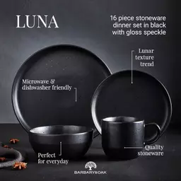 Dark, dramatic and dazzling, the Luna Dinnerware Set brings a bold look to your home with its deep black colouring and semi-matte speckled detailing. This 16-piece set is sure to make an impression at mealtimes with co-ordinating designs across 4 dinner plates, 4 side plates, 4 bowls and 4 mugs. Created from durable stoneware, each piece provides long-lasting quality to cater for countless dinner parties and family breakfasts. The set is microwave and dishwasher-friendly, although hand-wash is recommended to maintain the premium hand-painted finish.