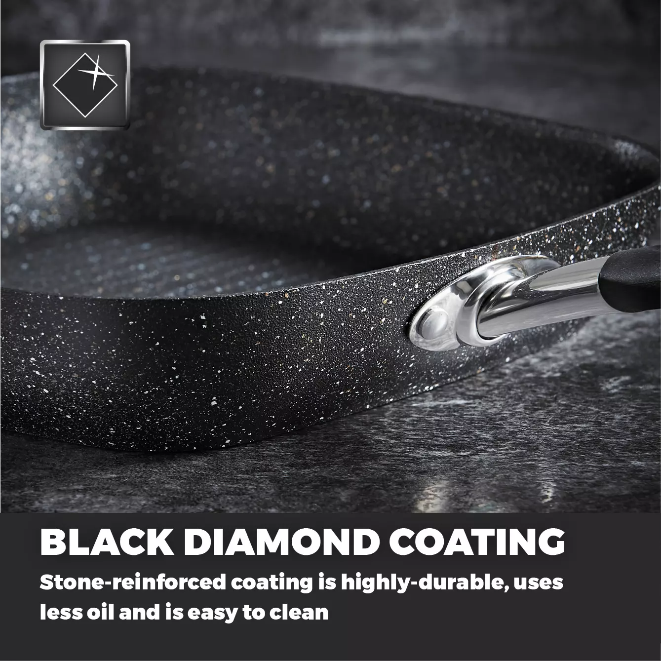 Stone-reinforced coating is 7 times stronger than standard non-stick coating, requiring little or no oil for healthier cooking