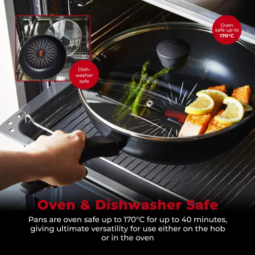 Bonded Steel Induction Ready base offers the versatility to use on any hob type, including induction. The pan is oven safe up to 170C for up to 40 minutes, giving ultimate versatility for use either on the hob or in the oven.
