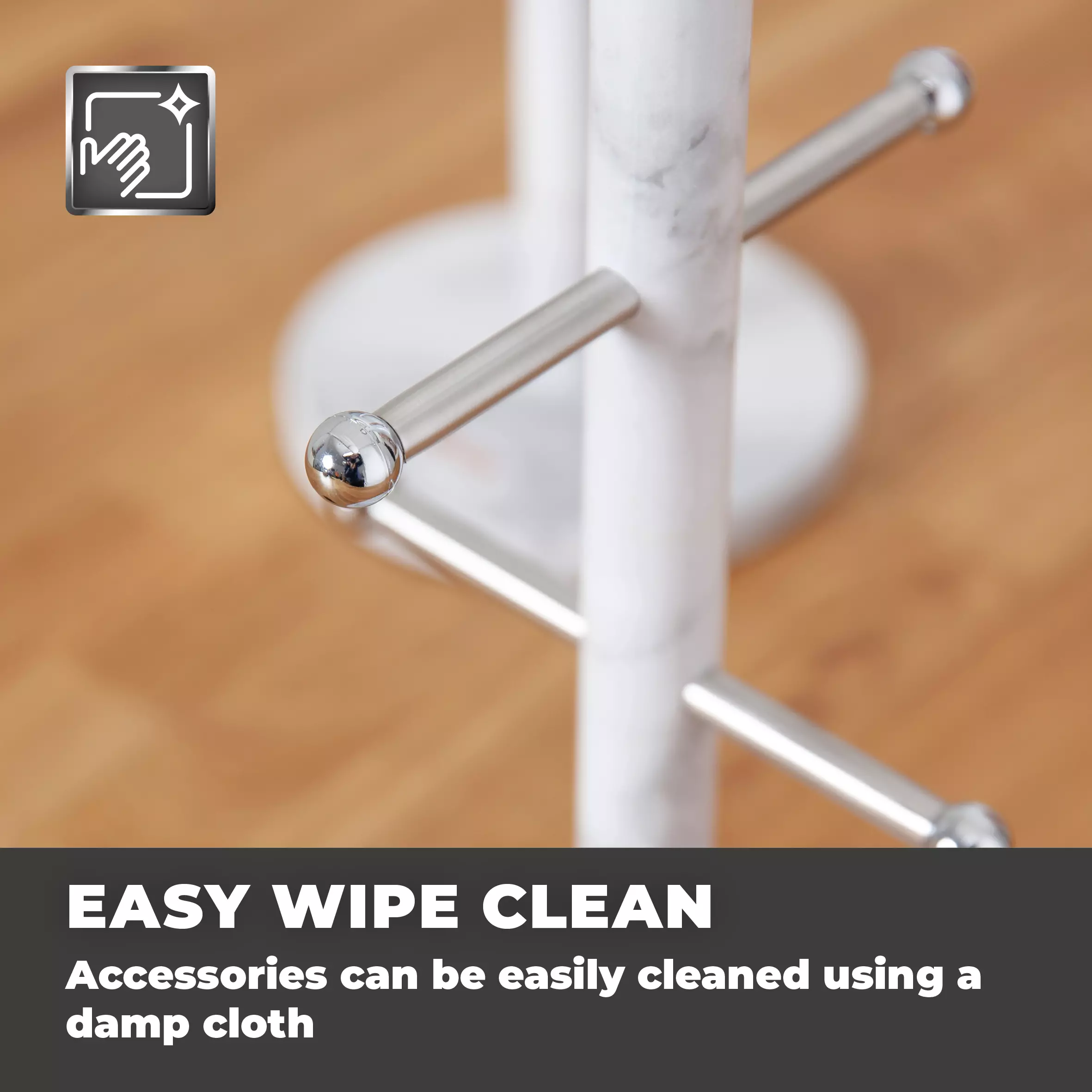 Keep your kitchen colour co-ordinated and countertop neatly organised with this matching marble storage set from Tower. The set includes a mug tree and towel pole, each constructed from durable stainless steel with a white marble-effect exterior to add a subtle touch of sophistication to your surfaces. The mug tree features stainless steel branches and stoppers to secure your cups in place, providing a safe and stylish way to store up to 6 of your go-to mugs at once.