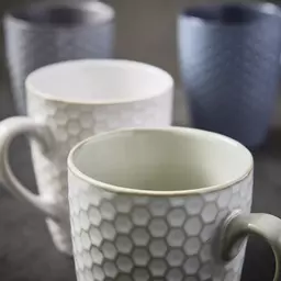 4 piece mug set with embossed honeycomb effectReactive glaze with an embossed effect for a subtle rustic feel