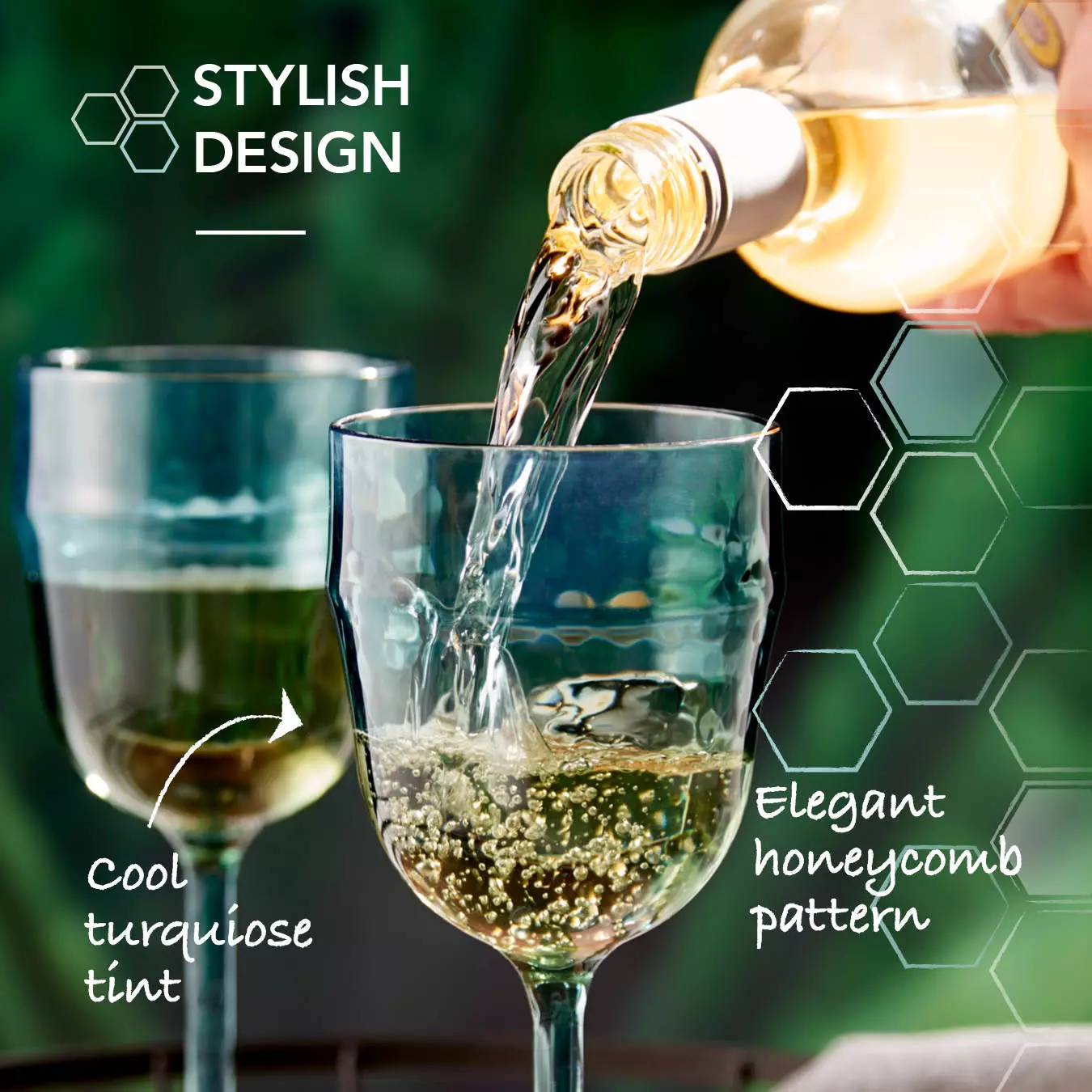 Easily-portable and lightweight material makes this set suitable for a variety of occasions both indoors and outdoors. Designed with an elegant honeycomb hexagonal pattern and glass-effect turquoise tint, this sophisticated collection lets you serve and entertain in style.