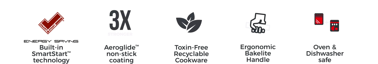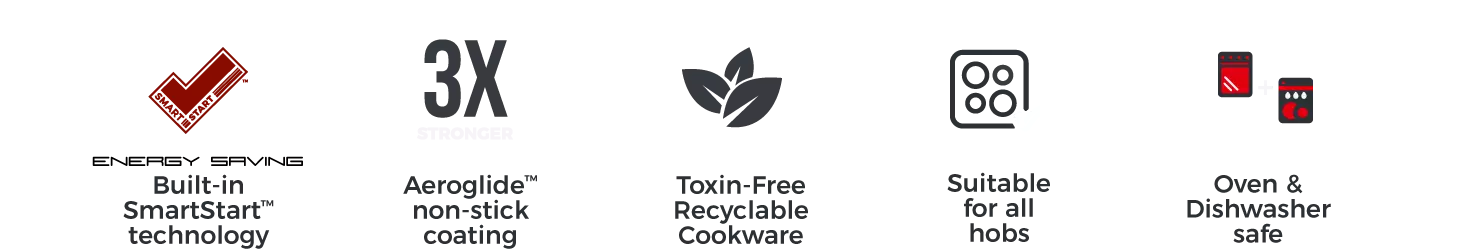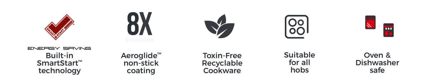 Toxin-free cookware features on all ranges of Smart Start pans and are free from harmful chemicals such as PFAS, PFOA, Lead and Cadmium.