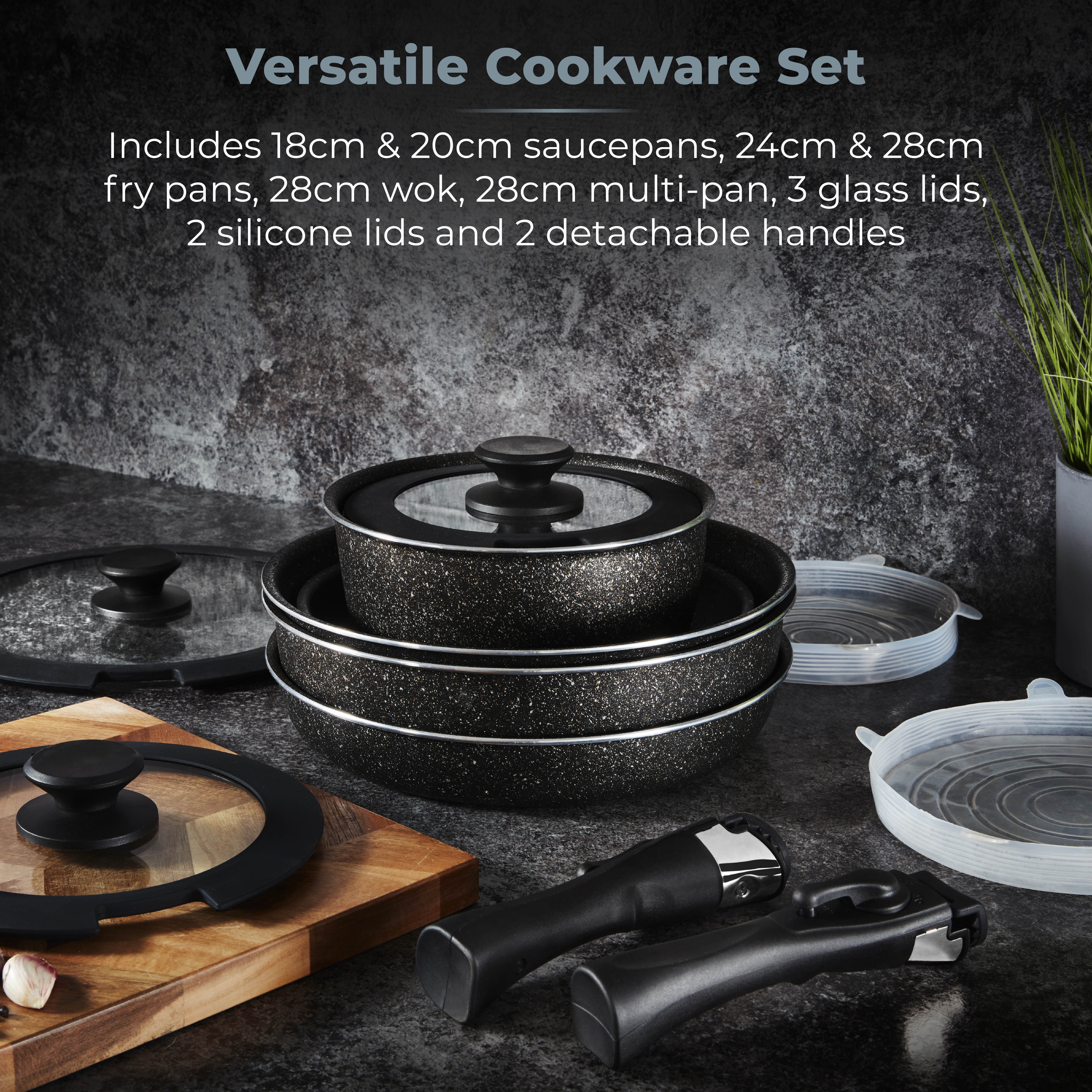 Includes 18cm & 20cm saucepans, 24cm & 28cm fry pans, 28cm wok, 28cm multi-pan, 3 glass lids, 2 silicone lids and 2 detachable handles, perfect for cooking a wide variety of dishes