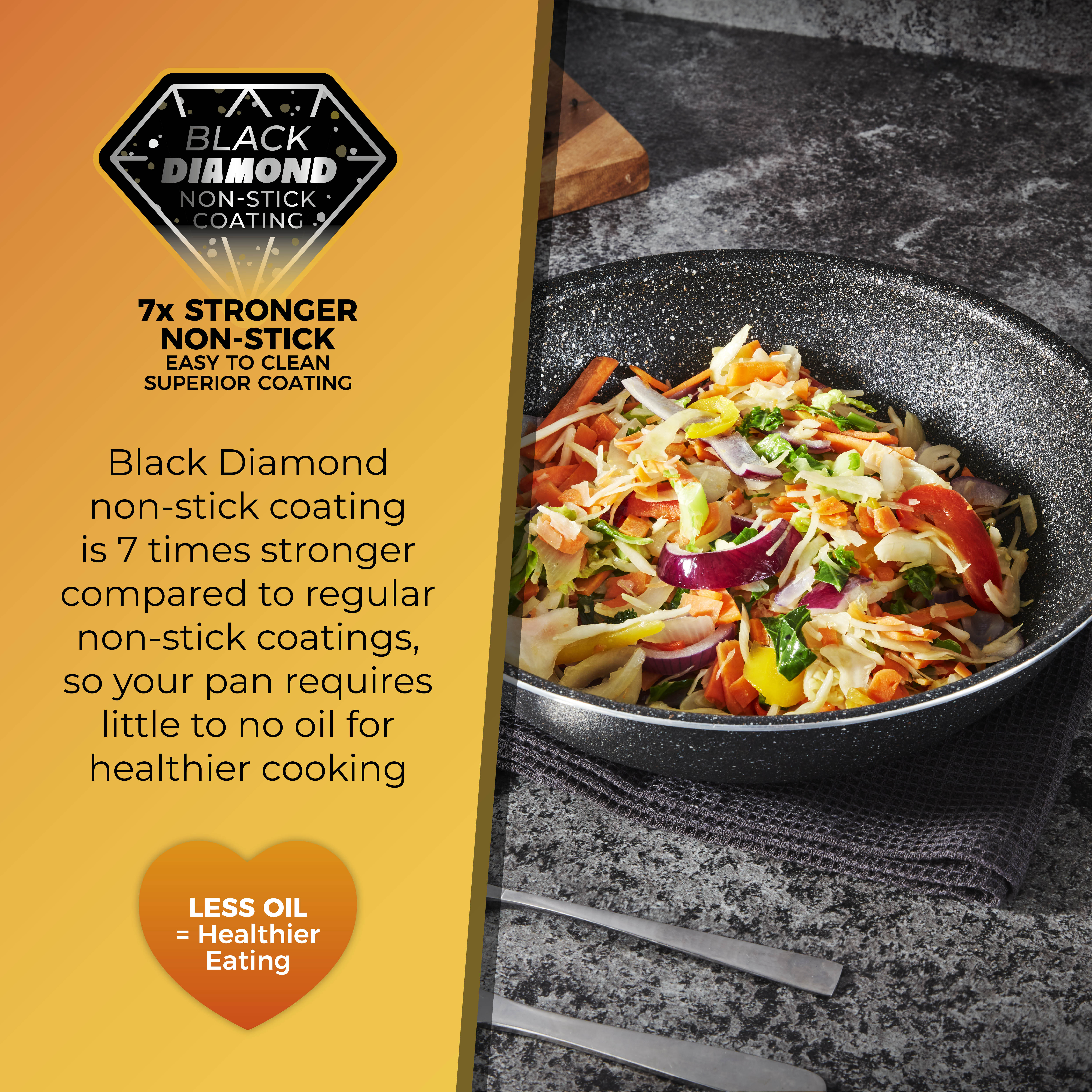 Each pan features a Black Diamond non-stick coating that is 7x stronger compared to regular non-stick coatings, so your pan requires little to no oil for healthier cooking