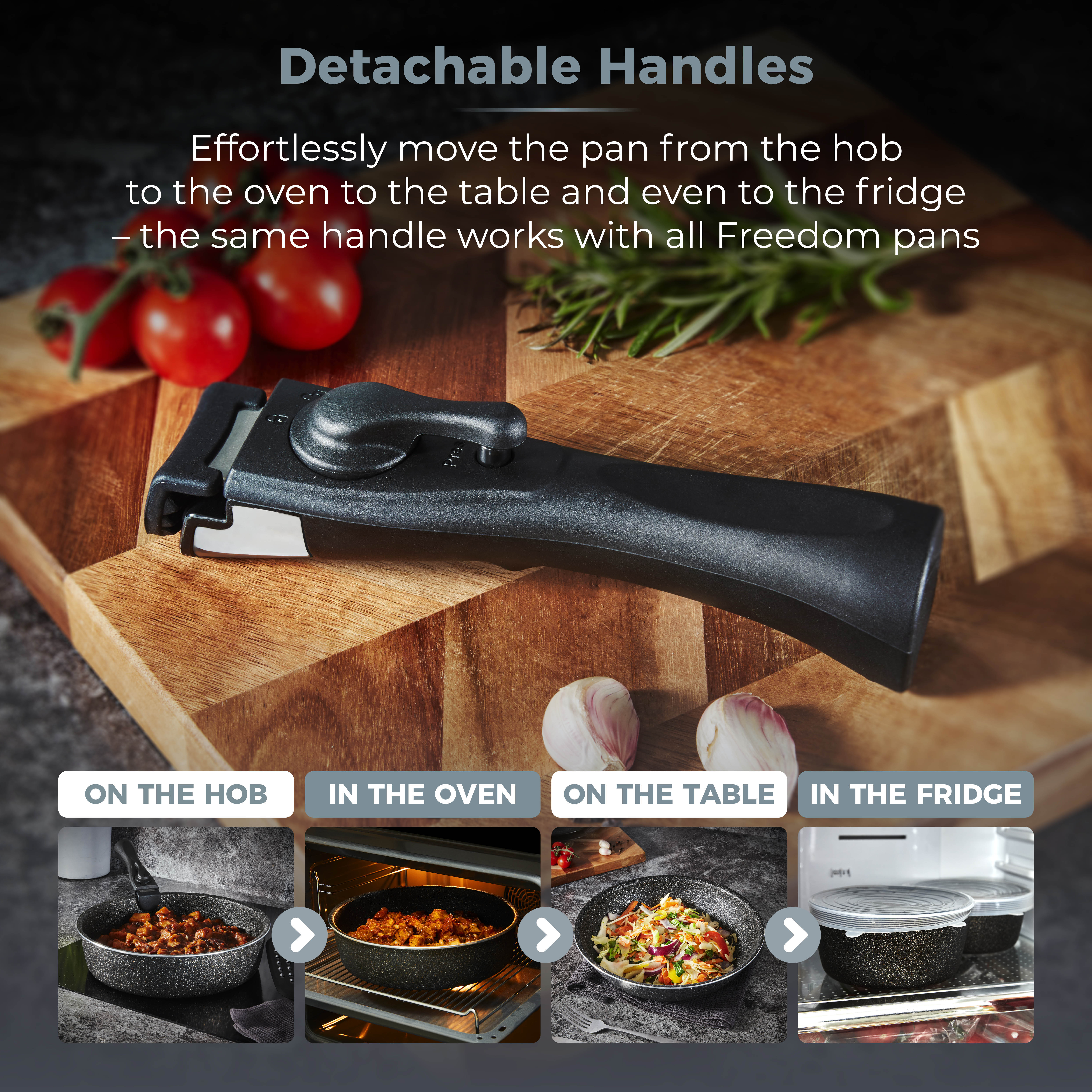 The soft touch Bakelite handles can be easily detached and used with the complete Freedom cookware range. It allows you to effortlessly move the pans from hob to oven before serving to your table. A dual locking system keeps the handle securely attached