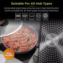 The bonded steel base is compatible with all hob types including induction, providing even heat distribution ensuring every part of the dish is cooked thoroughly