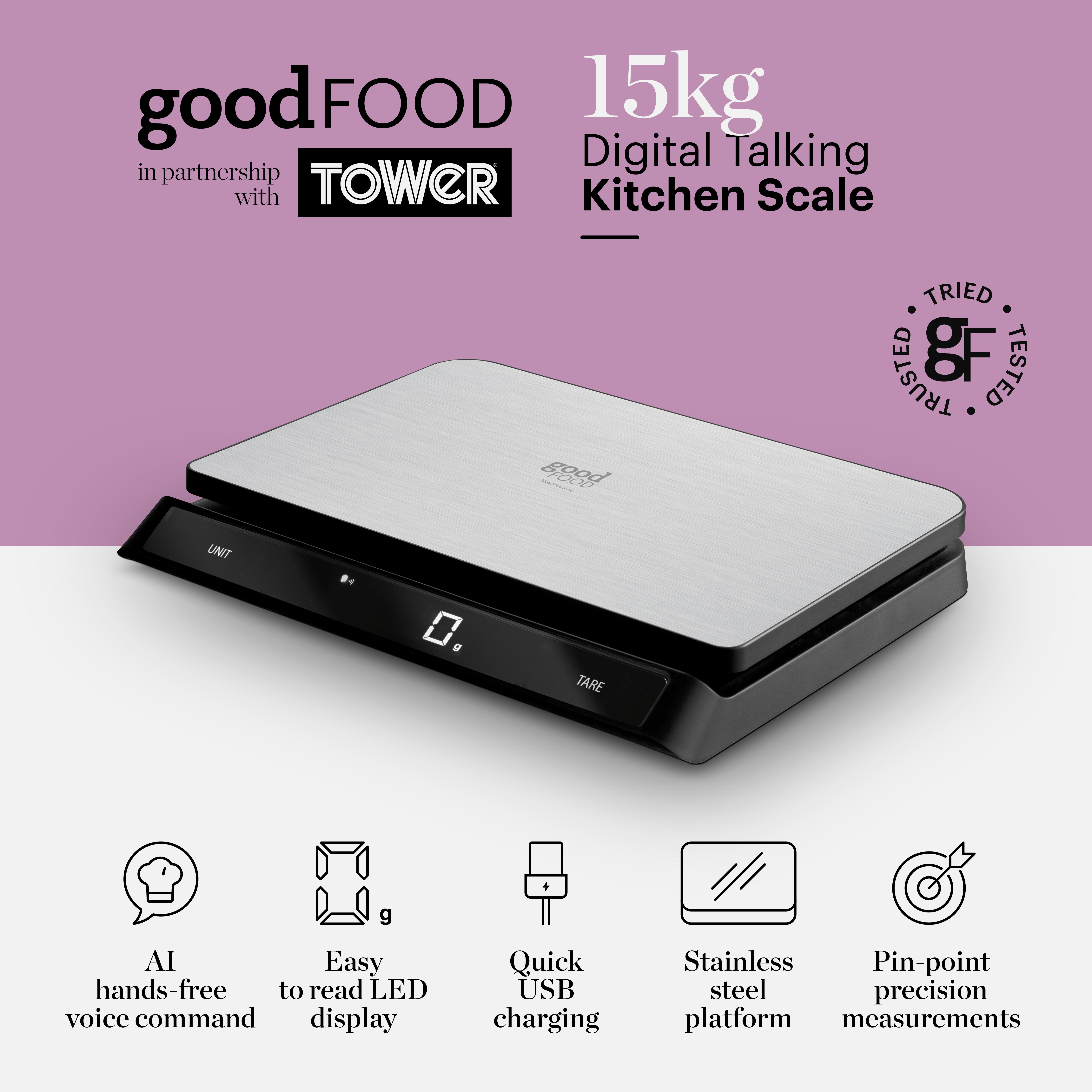 Take the fuss out of food preparation and baking with this professional quality Digital Intelli Kitchen Scale from Good Food in partnership with Tower. Voice controls will let you enjoy hands free operation with a variety of commands that offer simple and efficient use. Choose from Turn on/off, reset to zero, removing weight, changing unit, locking/unlocking weight and volume control options for simple and fuss free use. The 15kg weight limit will let you measure multiple ingredients at once and goes up in 1g increments, whilst it can be adjusting to measure ounces, millilitres or grams for versatility. The high quality stainless steel platform is durable and built for long lasting use, whilst a simple wipe clean is all that is required to keep the scale in pristine condition. The LED display is easy to read, clearly showing your selected unit and measurements for simple and accurate use.