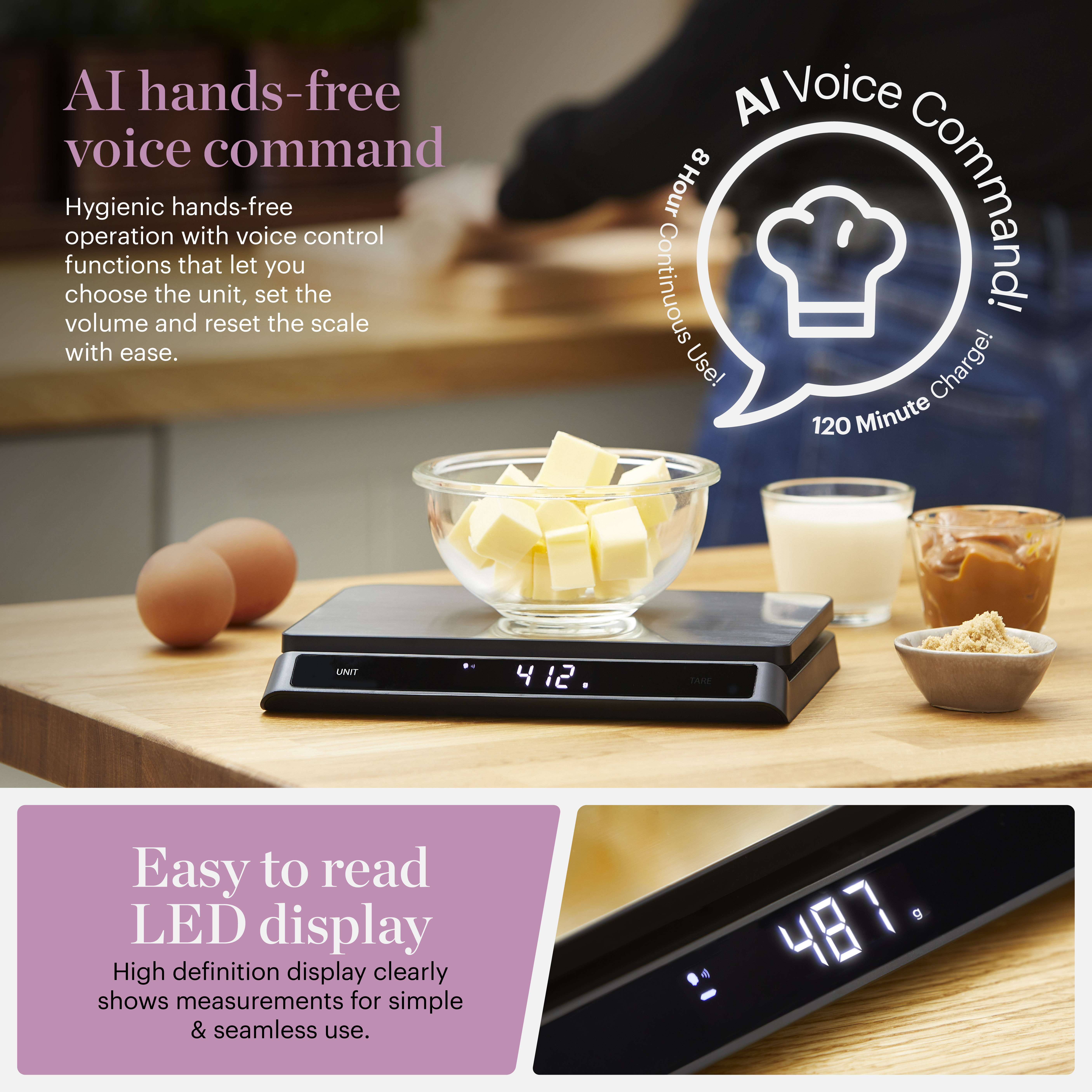 Take the fuss out of food preparation and measuring ingredients with built-in voice command. Choose from turn on/off, reset to zero, remove weight, change units, lock or unlock weight and volume control options for hygienic, hands free operation. Voice control is also ideal for visually impaired users, providing the convenience to easily measure ingredients for fuss-free baking.