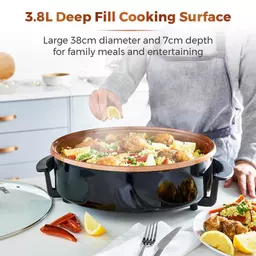 With large 38cm diameter cooking surface and 7cm depth, this multi-pan is perfect for cooking up fluffy pancakes for breakfast, sizzling chicken fajitas after a busy day, or impressing your guests with a juicy steak stir fry
