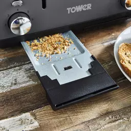 The pop-out crumb tray can be easily removed for cleaning to minimise mess on your kitchen surfaces