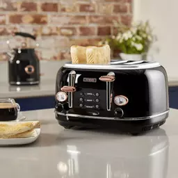Be a toasting champion with the Tower Bottega rose gold 4-slice toaster. Featuring variable browning control that gives you precise toasting results that suits your taste. From loaves, bagels and crumpets, the self-centring function will consistently toast your items to perfection after every use. For more functionality, the toaster includes a defrost, reheat and cancel options for better control and convenience for toasting frozen snacks.