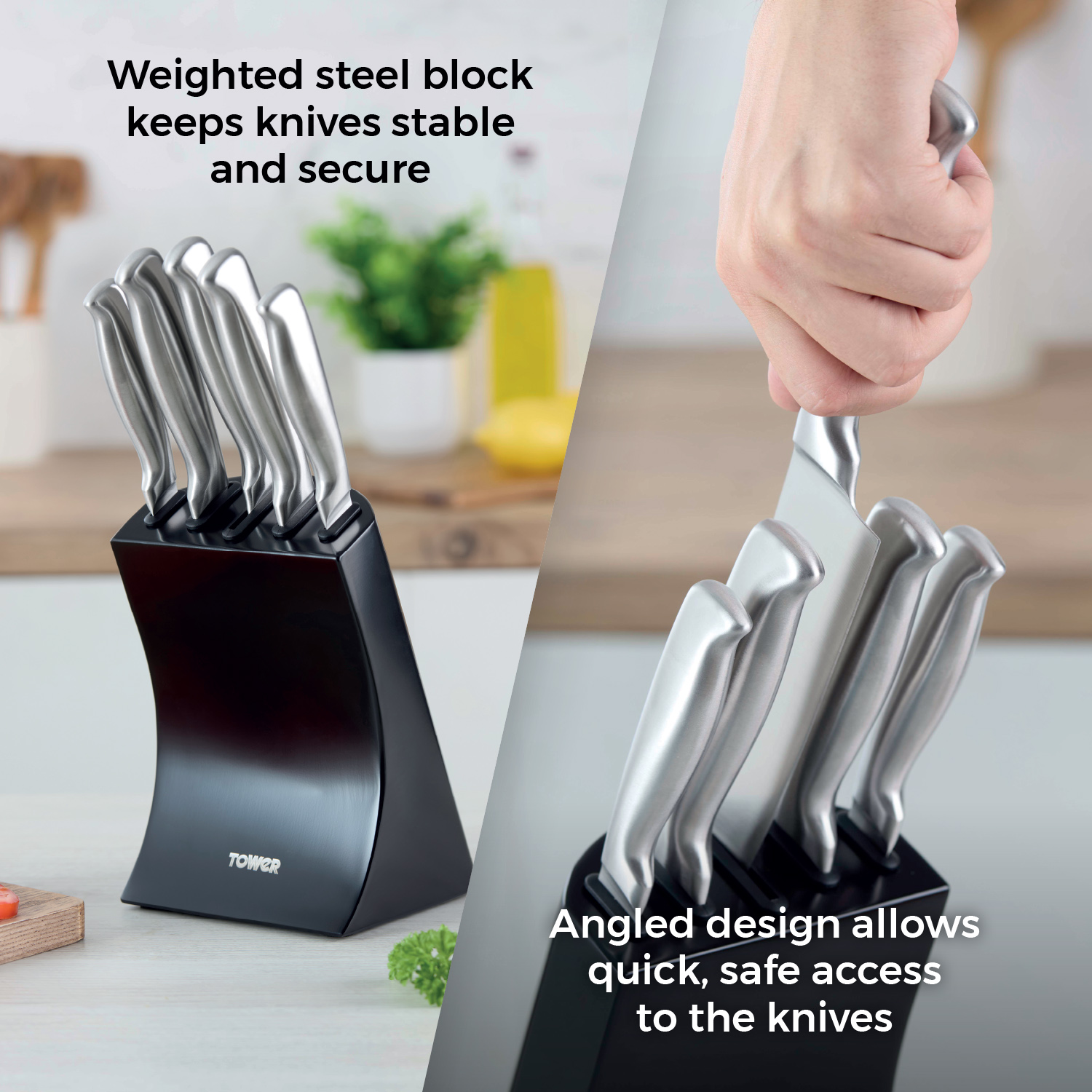 Weighted steel knife block for safe storageAngled design makes it easier to remove knives from block