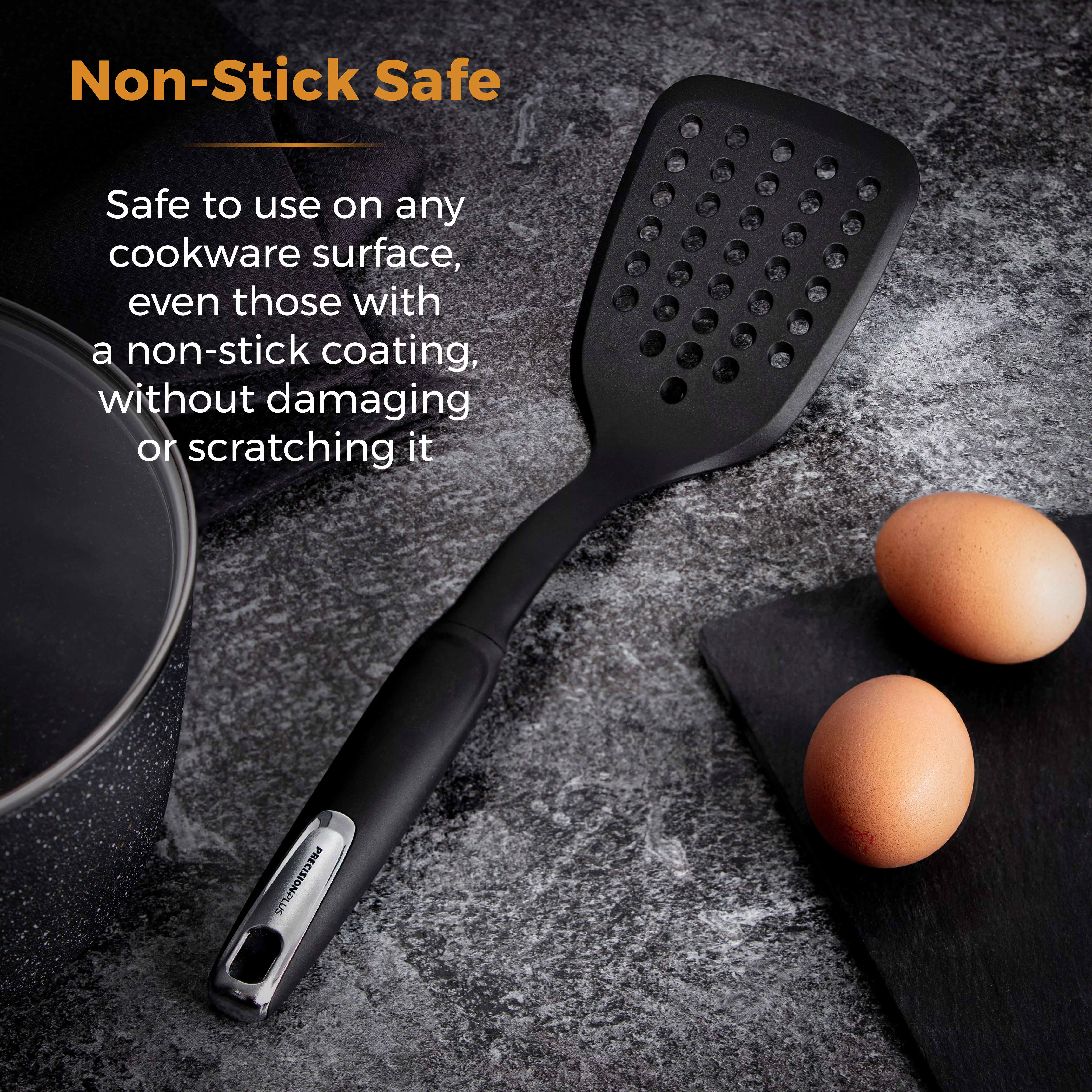 Versatile slotted turner is suitable for use on any cookware surface, even those with a non-stick coating without damaging or scratching it.
