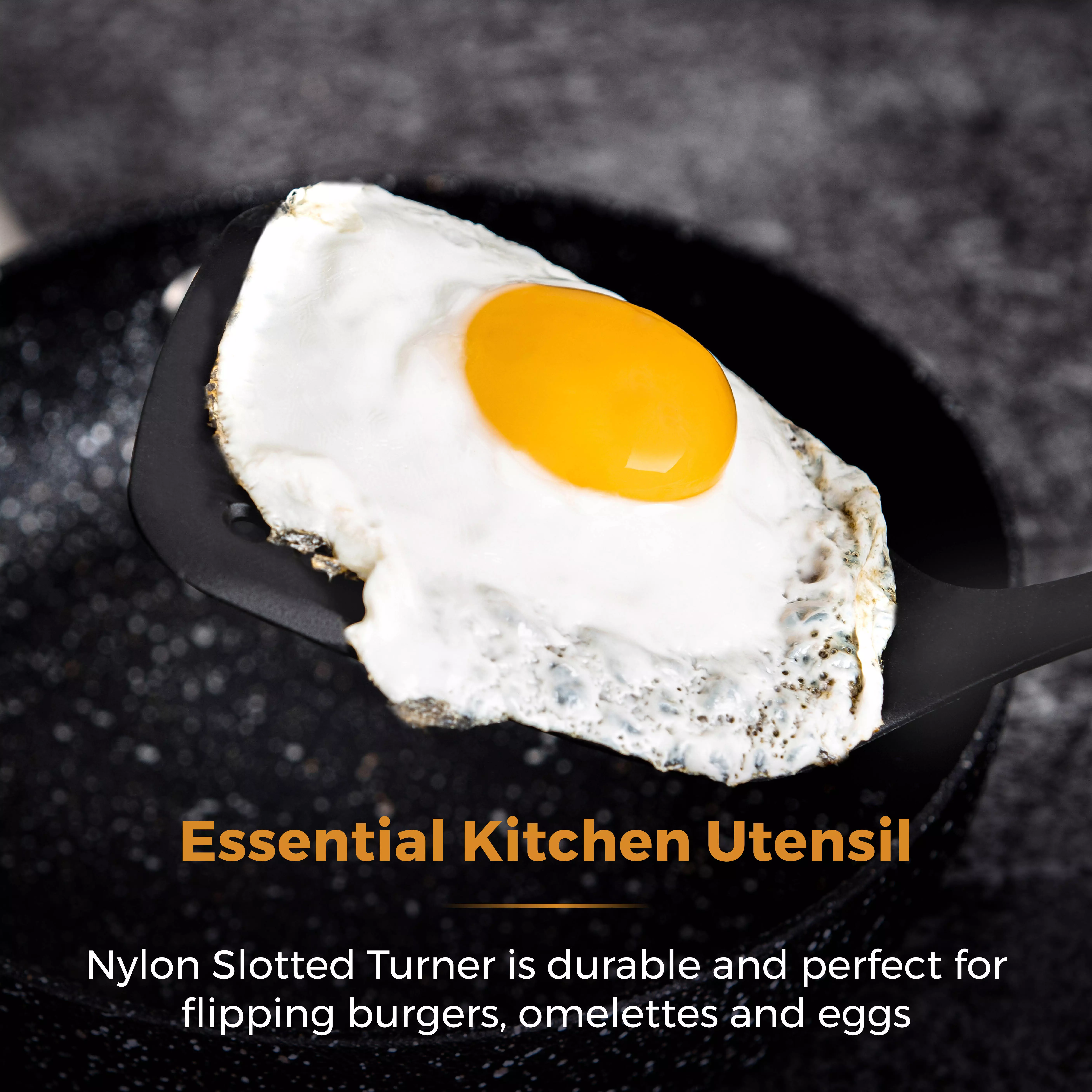 Nylon slotted turner is built for strength, perfect for flipping burgers, omelettes and eggs