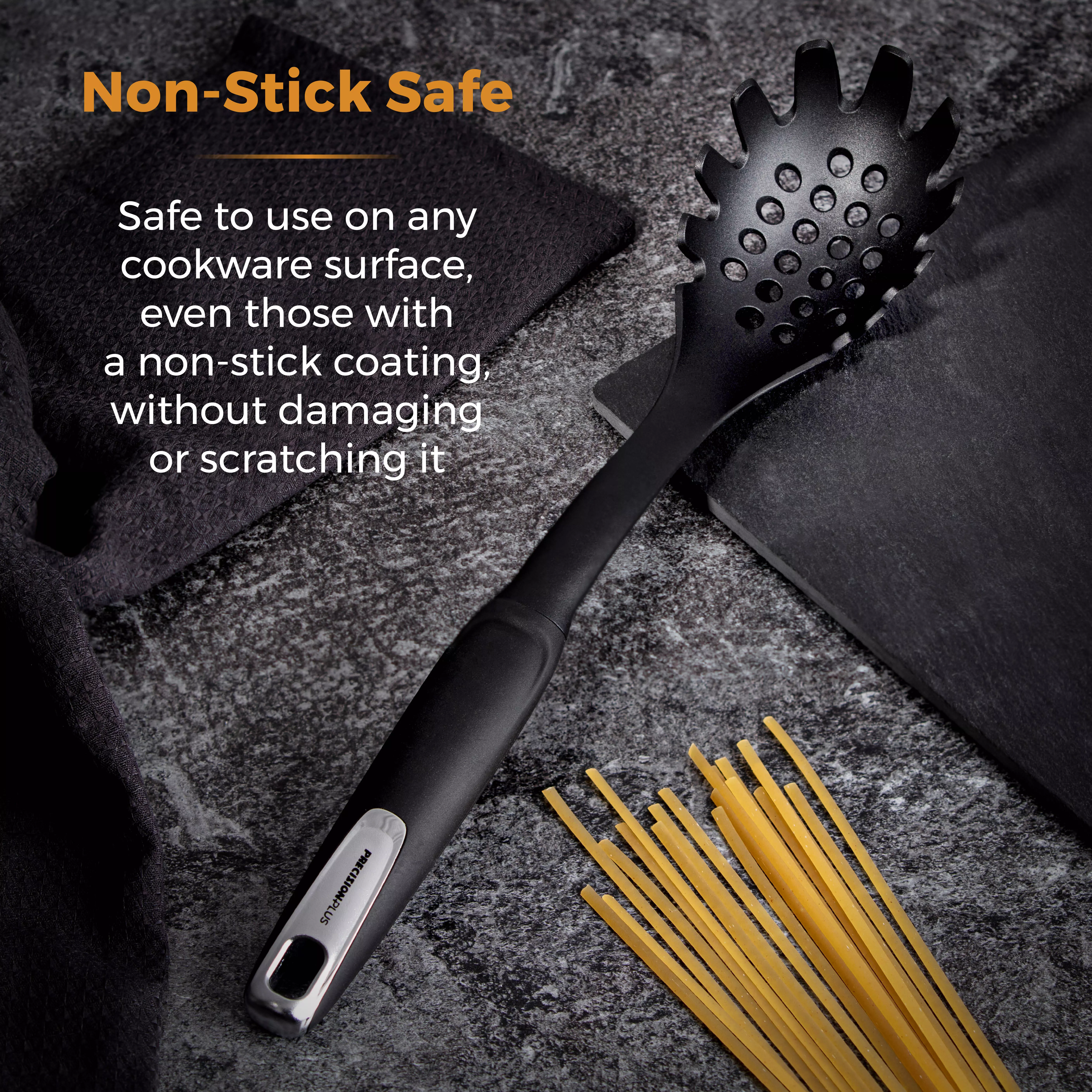 Versatile pasta server is suitable for use on any cookware surface, even those with a non-stick coating without damaging or scratching it.