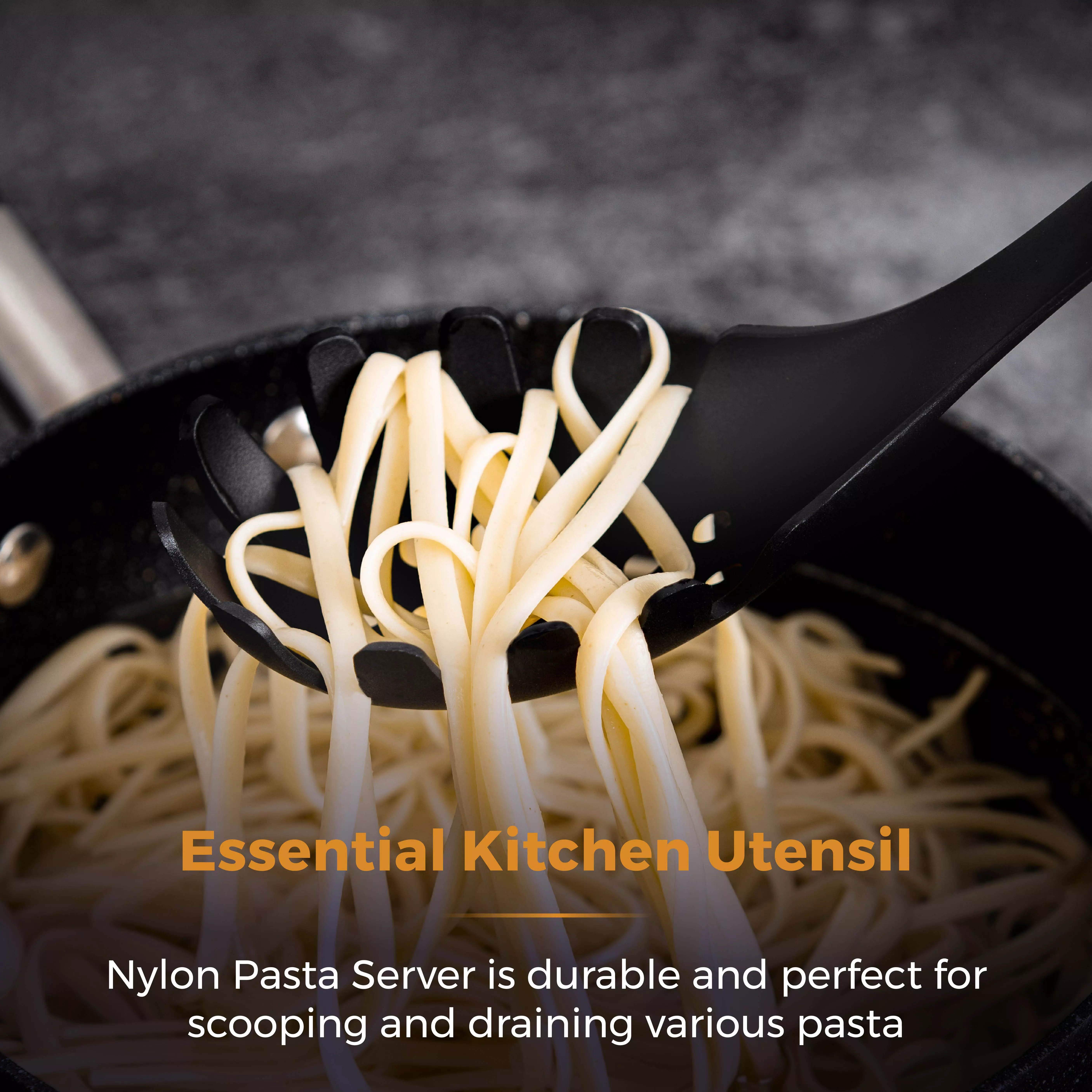 Nylon pasta server built for strength, perfect for scooping and draining your favourite pasta dishes