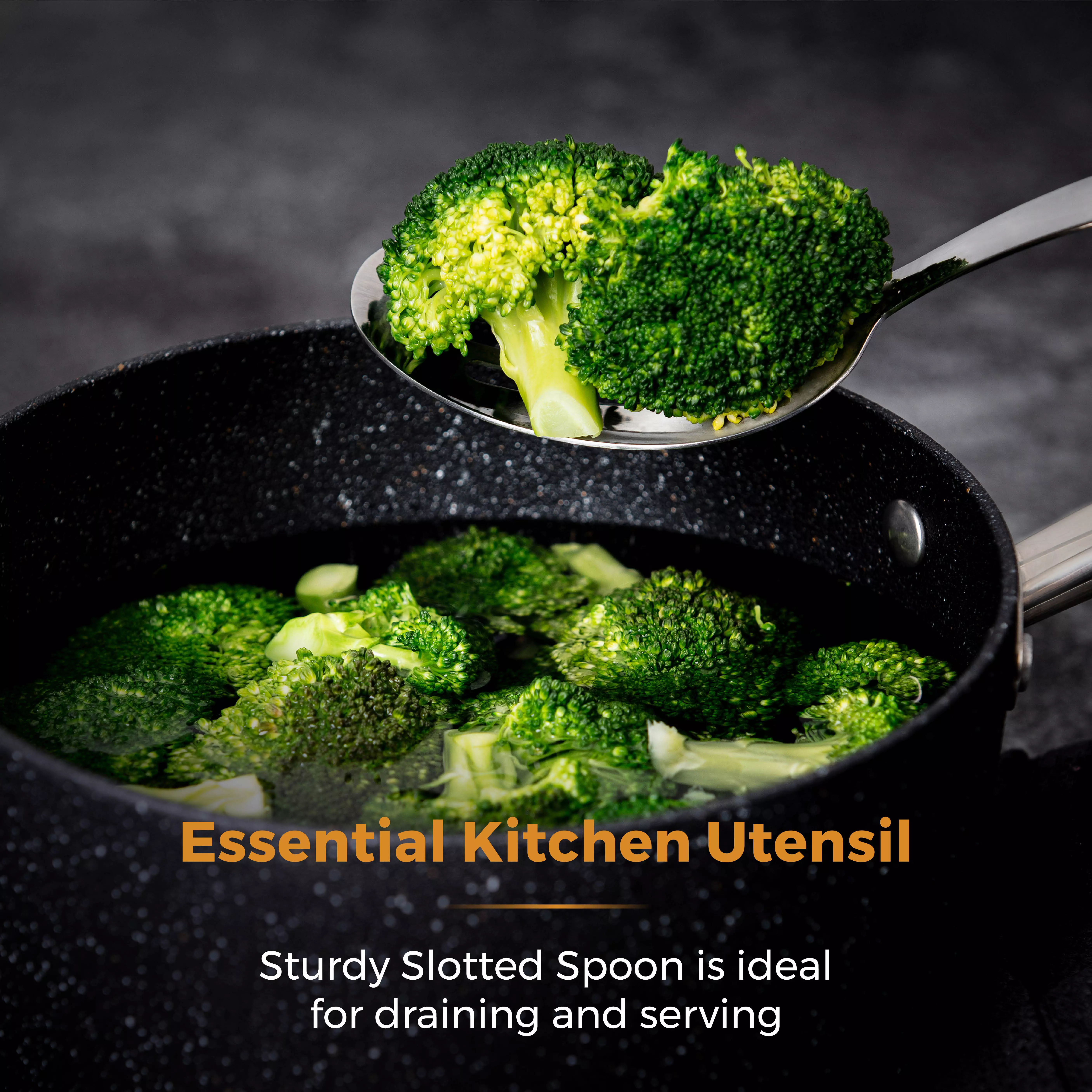 Sturdy stainless steel slotted spoon is essential for draining various vegetables, rice and pasta.